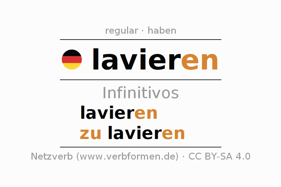 El verbo lavieren, conjugado completamente en todas las personas y números gramaticales en Infinitivo Presente Pasado perfecto.