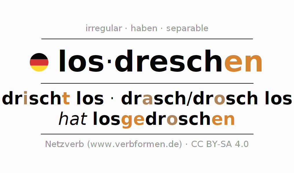El verbo losdreschen, conjugado completamente en todas las personas y números gramaticales en Infinitivo Presente Pasado perfecto.