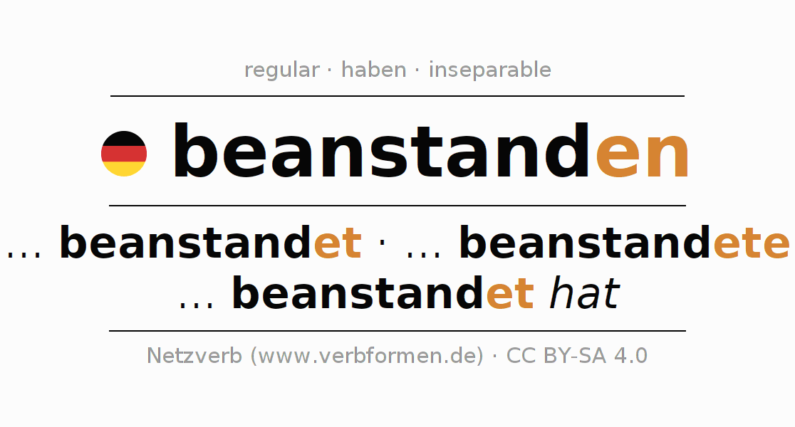 El verbo beanstanden, conjugado completamente en todas las personas y números gramaticales en Infinitivo Presente Pasado perfecto.