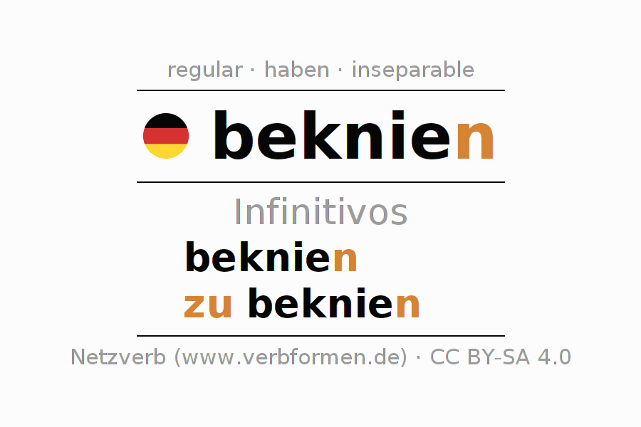 La conjugación de beknien en Infinitivo Presente Pasado perfecto forma básica Activo es beknien, zu beknien.Para construir esta formas se requiere seguir algunas reglas gramaticales y también las especificaciones para la conjugación de verbos simples de beknien en Infinitivo . Comentarios ☆