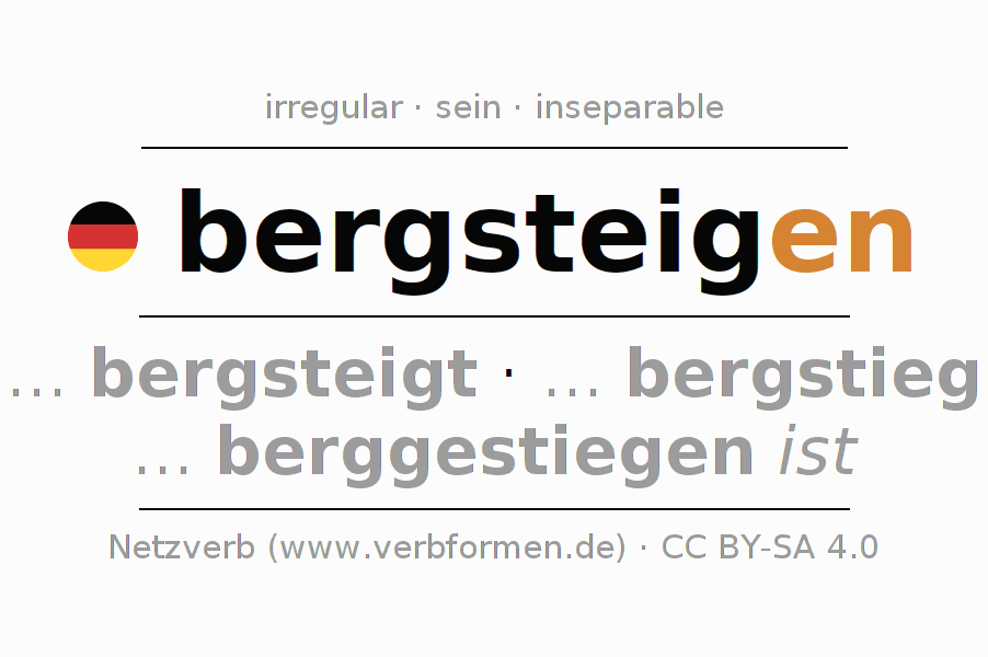 El verbo bergsteigen (ist), conjugado completamente en todas las personas y números gramaticales en Infinitivo Presente Pasado perfecto.