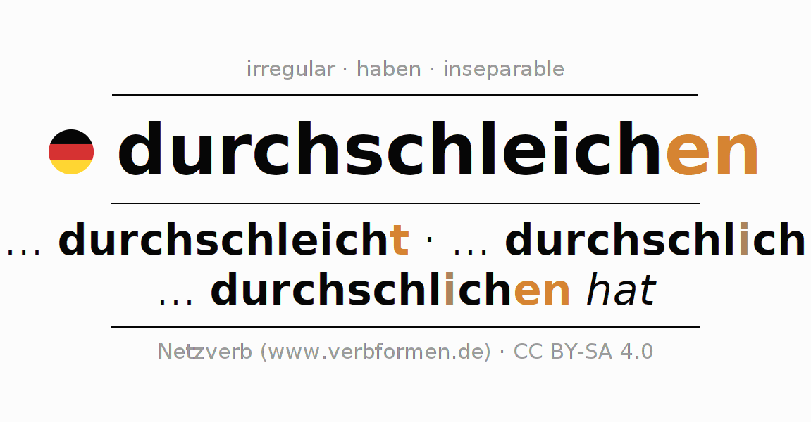 El verbo durchschleichen (hat), conjugado completamente en todas las personas y números gramaticales en Infinitivo Presente Pasado perfecto.