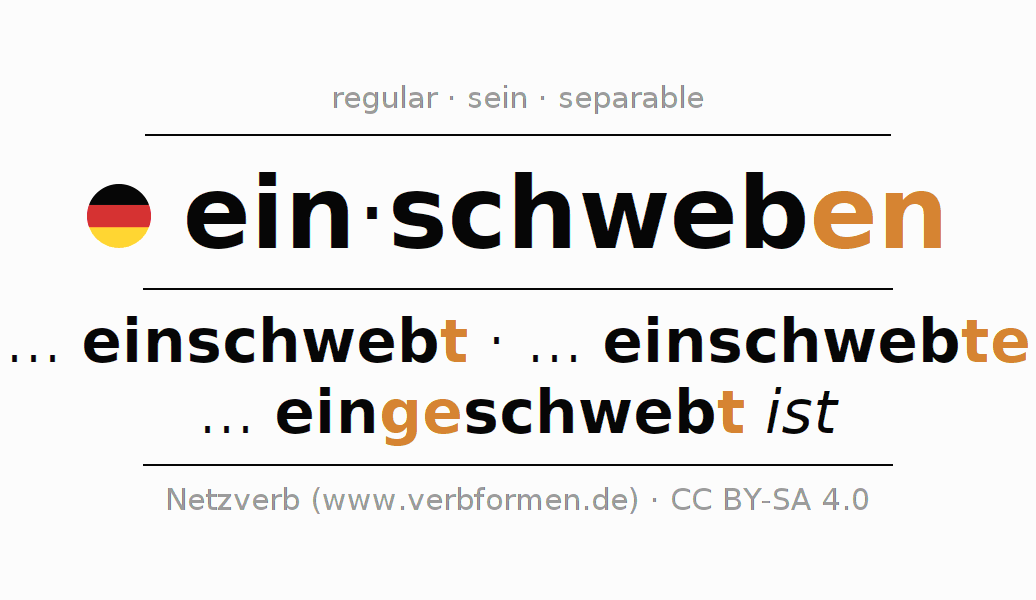 El verbo einschweben, conjugado completamente en todas las personas y números gramaticales en Infinitivo Presente Pasado perfecto.