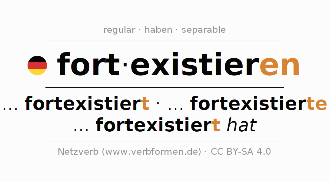 El verbo fortexistieren, conjugado completamente en todas las personas y números gramaticales en Infinitivo Presente Pasado perfecto.