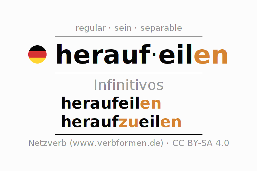 El verbo heraufeilen, conjugado completamente en todas las personas y números gramaticales en Infinitivo Presente Pasado perfecto.