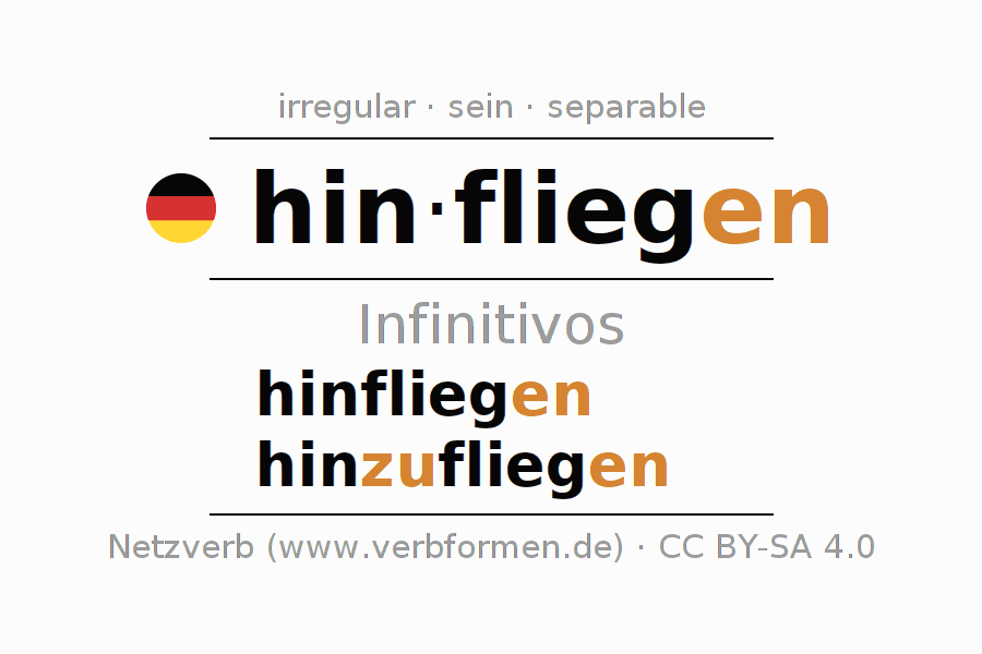 El verbo hinfliegen (ist), conjugado completamente en todas las personas y números gramaticales en Infinitivo Presente Pasado perfecto.