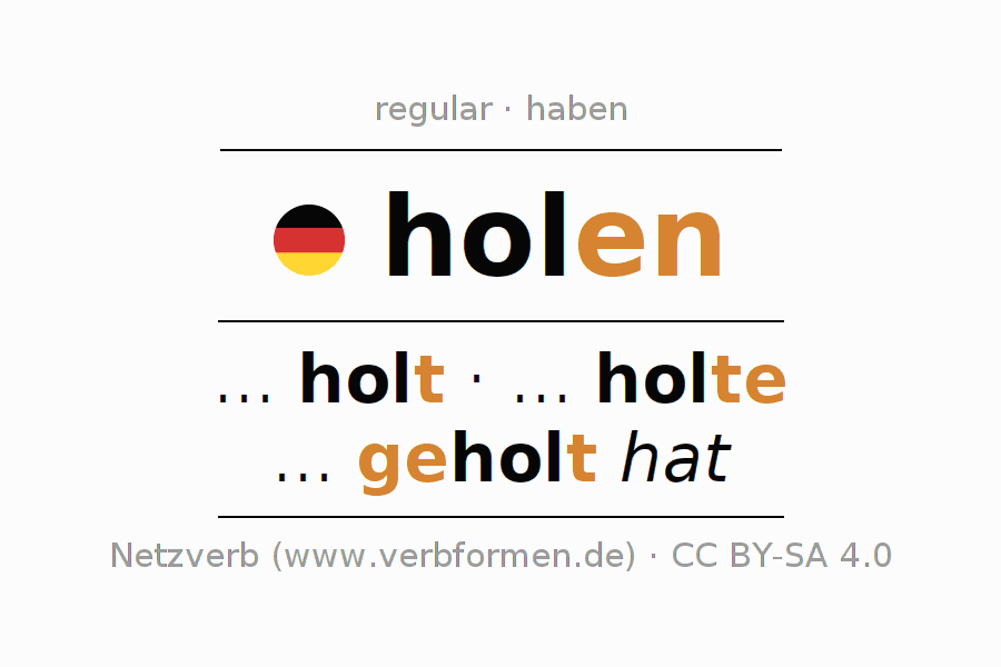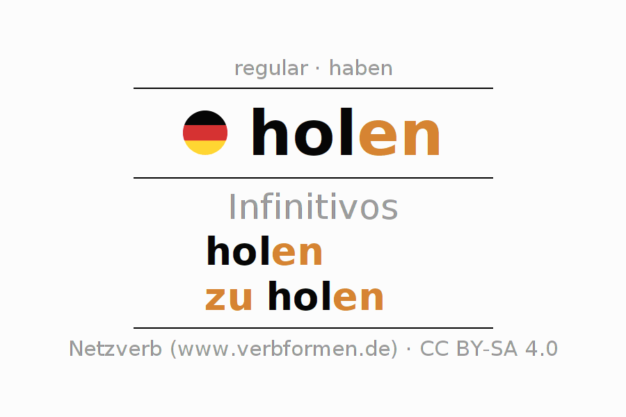 La conjugación de holen en Infinitivo Presente Pasado perfecto forma básica Activo es holen, zu holen.Para construir esta formas se requiere seguir algunas reglas gramaticales y también las especificaciones para la conjugación de verbos simples de holen en Infinitivo . Comentarios ☆