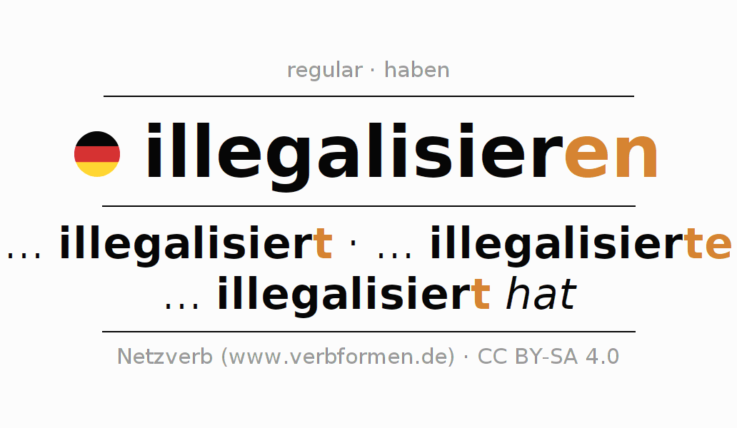El verbo illegalisieren, conjugado completamente en todas las personas y números gramaticales en Infinitivo Presente Pasado perfecto.