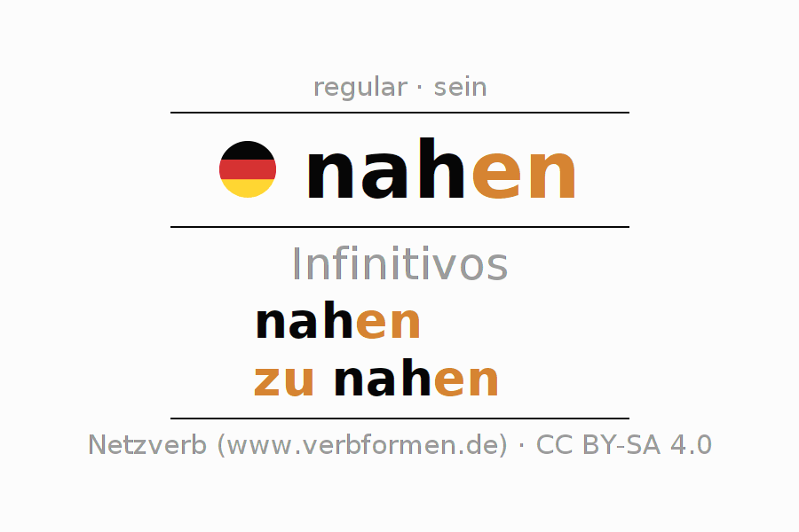 El verbo nahen (ist), conjugado completamente en todas las personas y números gramaticales en Infinitivo Presente Pasado perfecto.