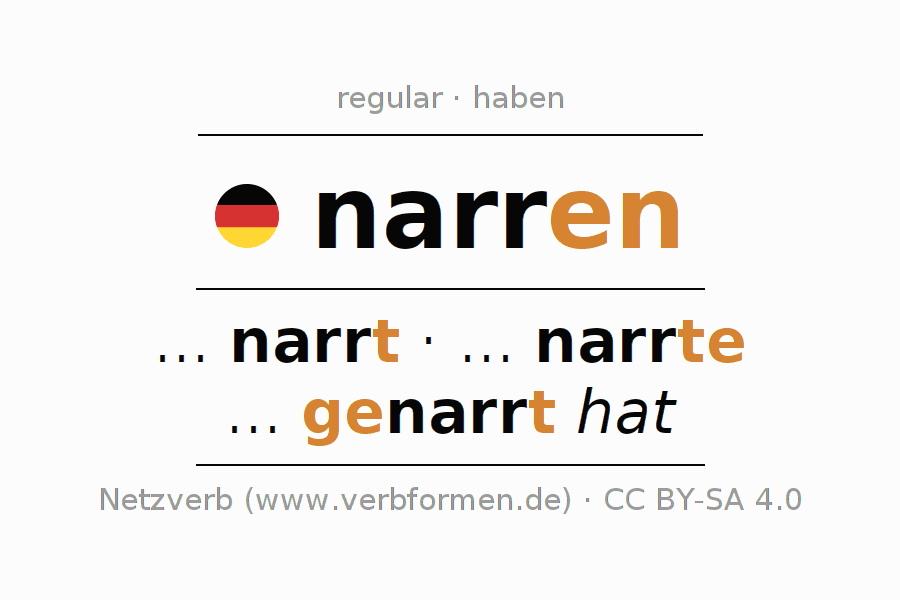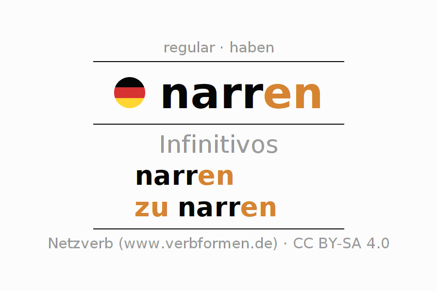 La conjugación de narren en Infinitivo Presente Pasado perfecto forma básica Activo es narren, zu narren.Para construir esta formas se requiere seguir algunas reglas gramaticales y también las especificaciones para la conjugación de verbos simples de narren en Infinitivo . Comentarios ☆