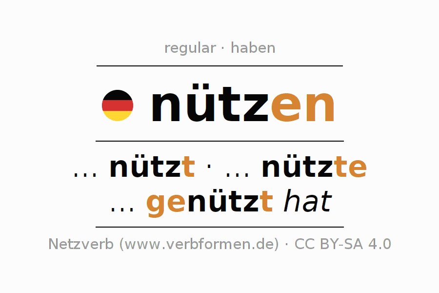 El verbo nützen, conjugado completamente en todas las personas y números gramaticales en Infinitivo Presente Pasado perfecto.