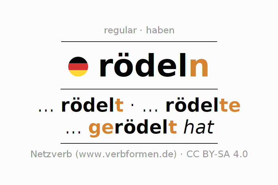 El verbo rödeln, conjugado completamente en todas las personas y números gramaticales en Infinitivo Presente Pasado perfecto.