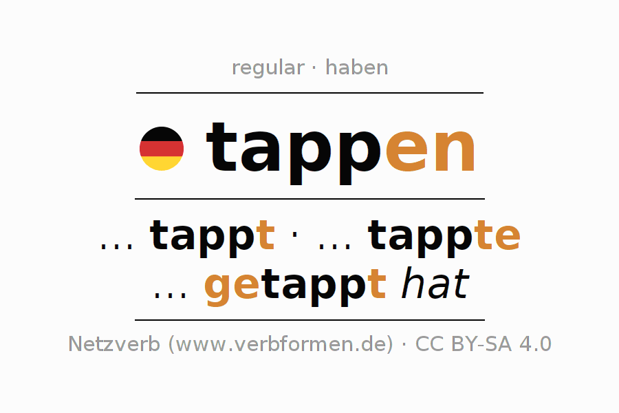 El verbo tappen (hat), conjugado completamente en todas las personas y números gramaticales en Infinitivo Presente Pasado perfecto.