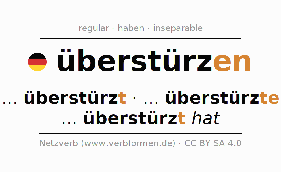 El verbo überstürzen, conjugado completamente en todas las personas y números gramaticales en Infinitivo Presente Pasado perfecto.