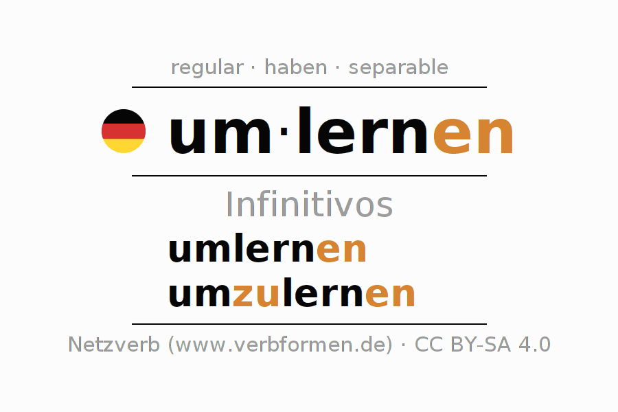 El verbo umlernen, conjugado completamente en todas las personas y números gramaticales en Infinitivo Presente Pasado perfecto.