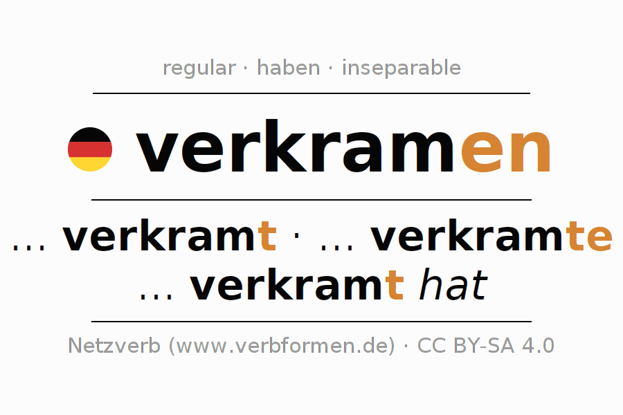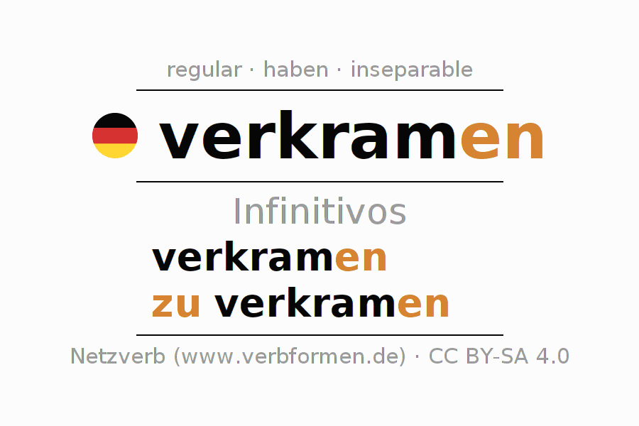 El verbo verkramen, conjugado completamente en todas las personas y números gramaticales en Infinitivo Presente Pasado perfecto.