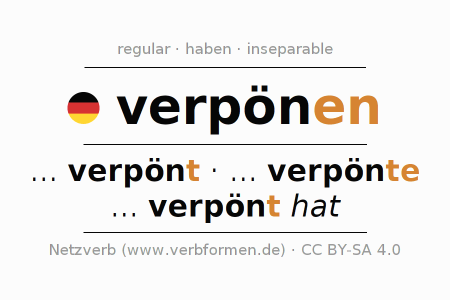 El verbo verpönen, conjugado completamente en todas las personas y números gramaticales en Infinitivo Presente Pasado perfecto.