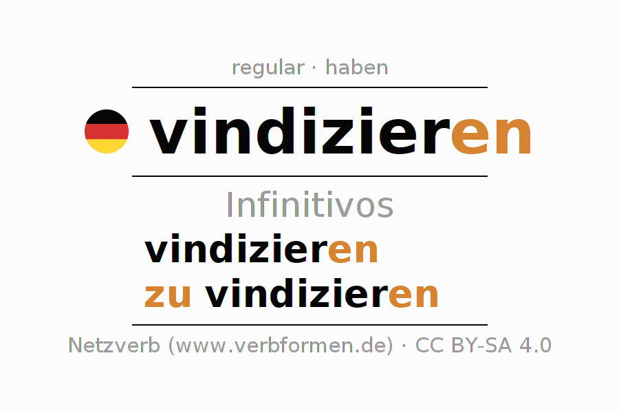 El verbo vindizieren, conjugado completamente en todas las personas y números gramaticales en Infinitivo Presente Pasado perfecto.