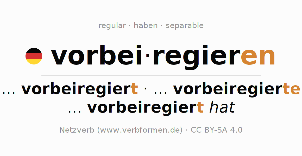 El verbo vorbeiregieren, conjugado completamente en todas las personas y números gramaticales en Infinitivo Presente Pasado perfecto.