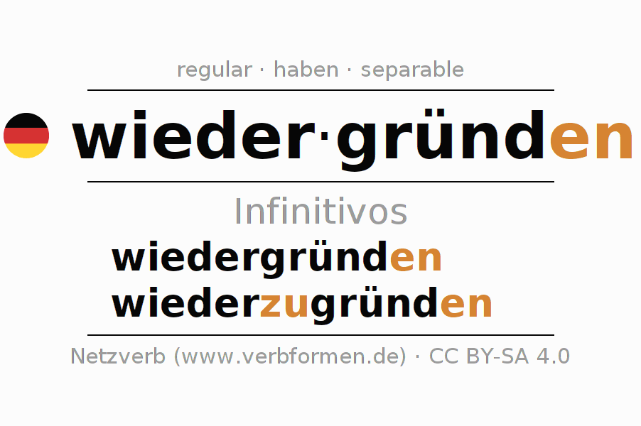 El verbo wiedergründen, conjugado completamente en todas las personas y números gramaticales en Infinitivo Presente Pasado perfecto.