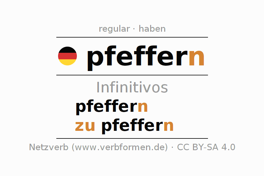 El verbo pfeffern, conjugado completamente en todas las personas y números gramaticales en Infinitivo Presente Pasado perfecto.