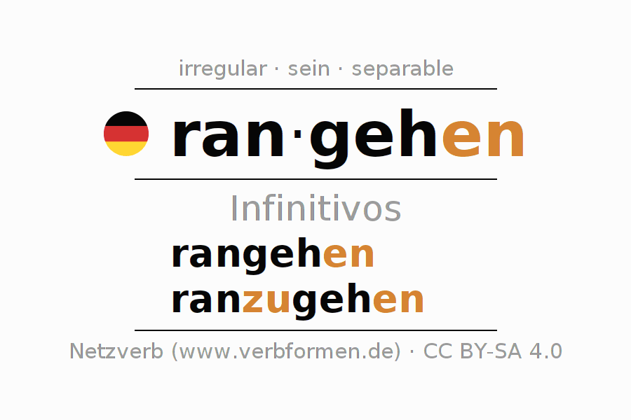 El verbo rangehen, conjugado completamente en todas las personas y números gramaticales en Infinitivo Presente Pasado perfecto.