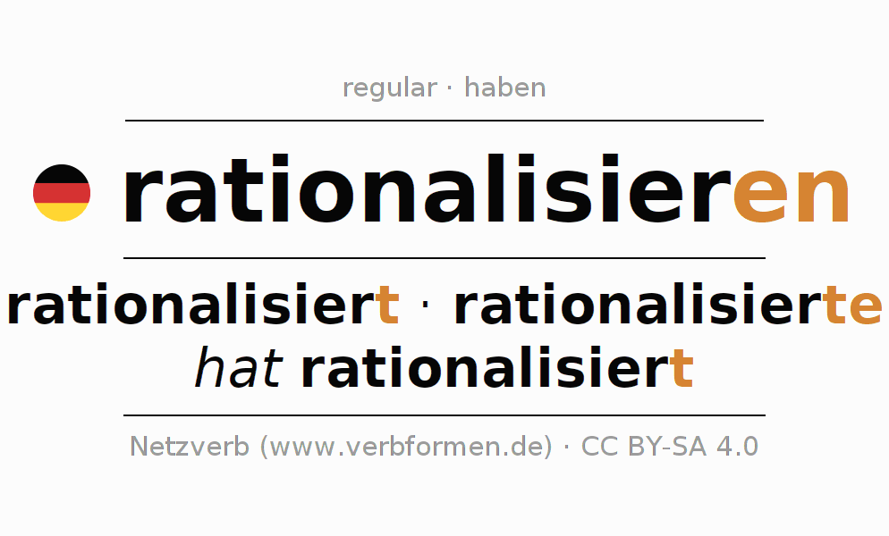 El verbo rationalisieren, conjugado completamente en todas las personas y números gramaticales en Infinitivo Presente Pasado perfecto.