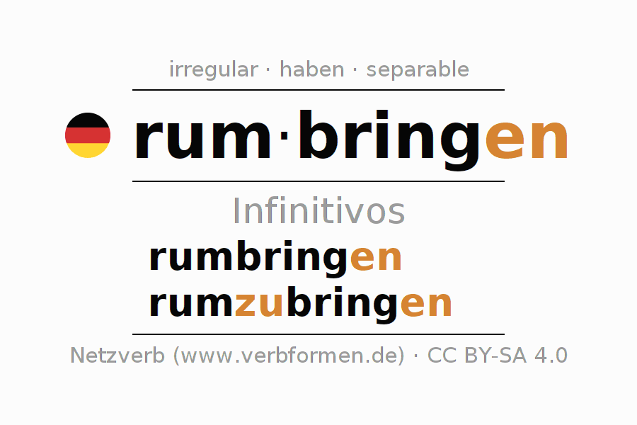 El verbo rumbringen, conjugado completamente en todas las personas y números gramaticales en Infinitivo Presente Pasado perfecto.
