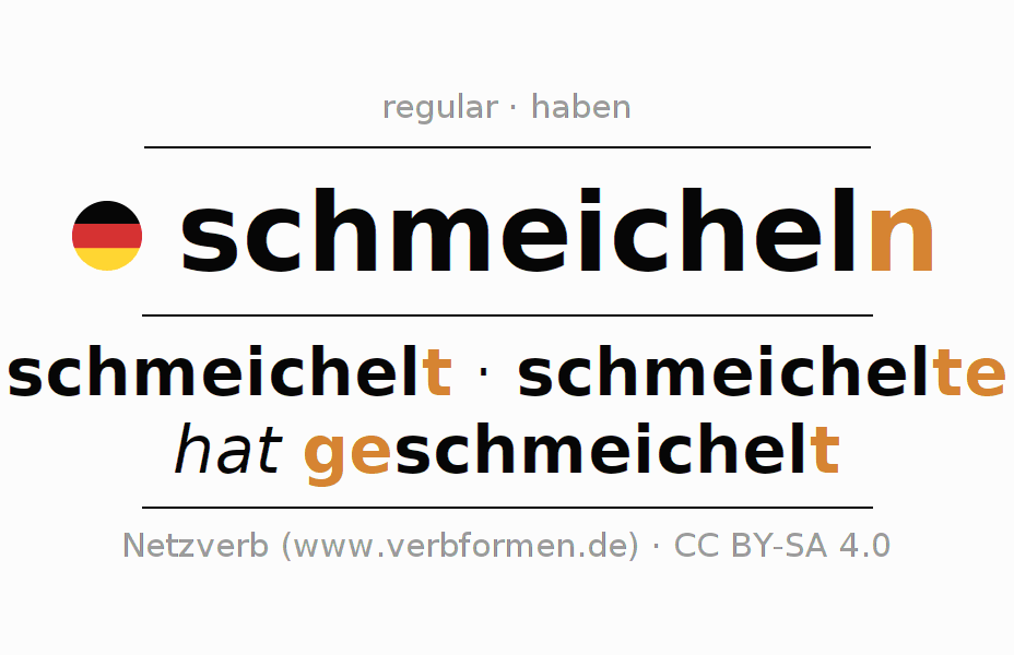 El verbo schmeicheln, conjugado completamente en todas las personas y números gramaticales en Infinitivo Presente Pasado perfecto.