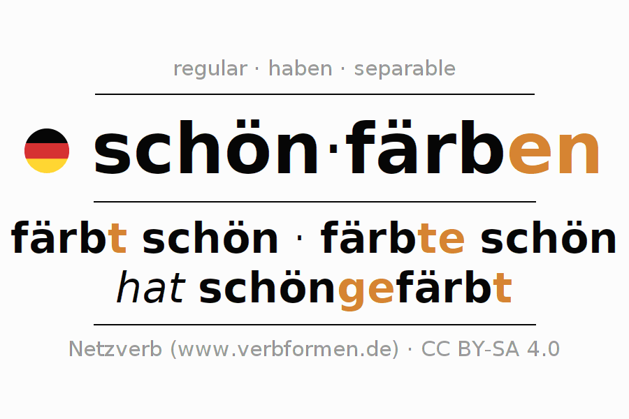 El verbo schönfärben, conjugado completamente en todas las personas y números gramaticales en Infinitivo Presente Pasado perfecto.