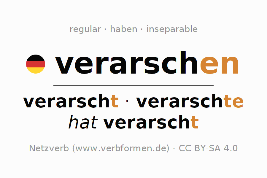 El verbo verarschen, conjugado completamente en todas las personas y números gramaticales en Infinitivo Presente Pasado perfecto.