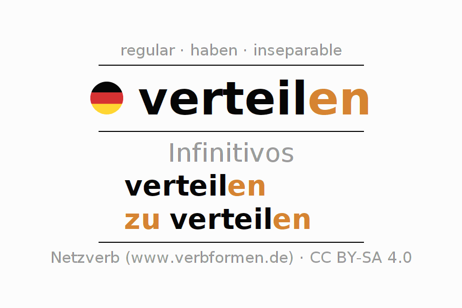 El verbo verteilen, conjugado completamente en todas las personas y números gramaticales en Infinitivo Presente Pasado perfecto.