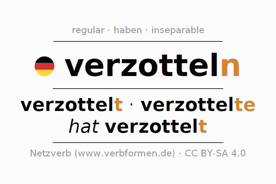El verbo verzotteln, conjugado completamente en todas las personas y números gramaticales en Infinitivo Presente Pasado perfecto.