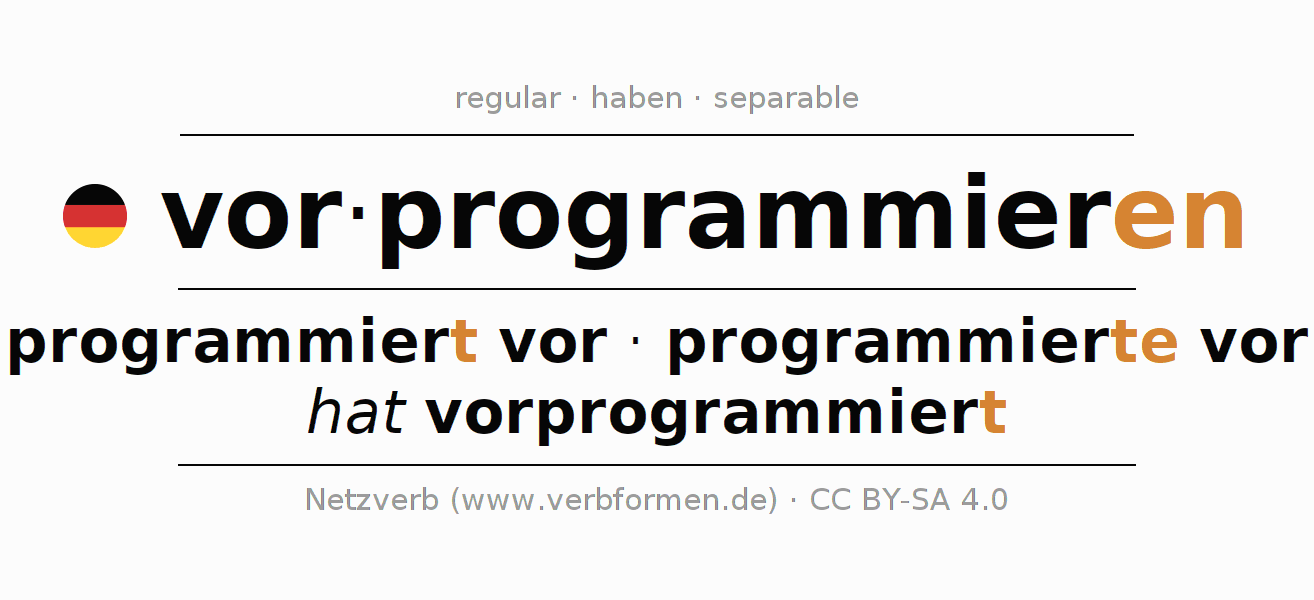 El verbo vorprogrammieren, conjugado completamente en todas las personas y números gramaticales en Infinitivo Presente Pasado perfecto.