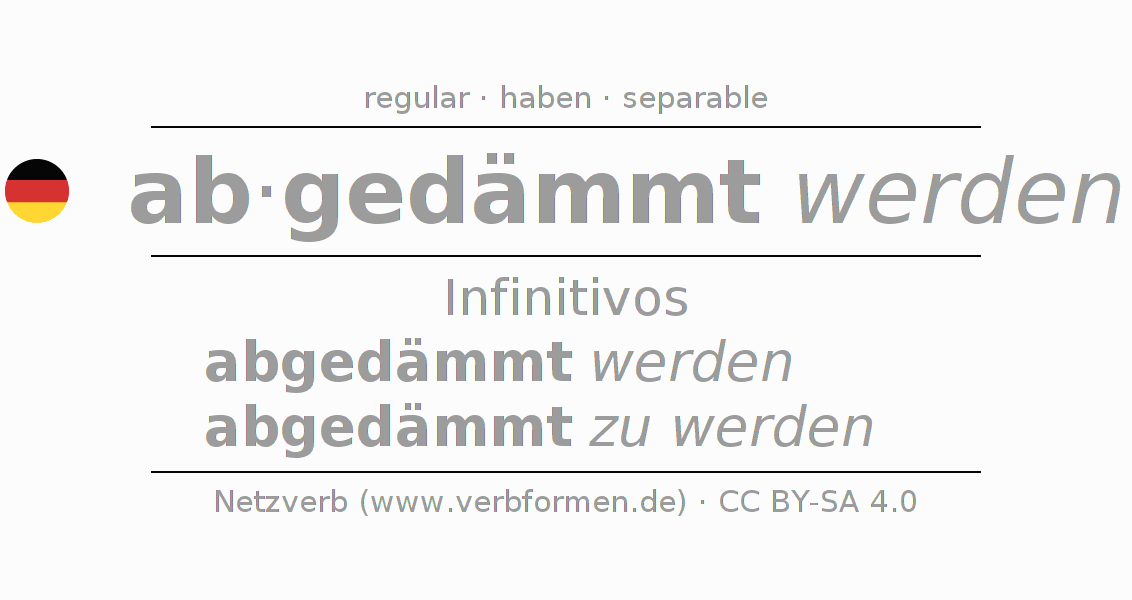 El verbo abdämmen, conjugado completamente en todas las personas y números gramaticales en Infinitivo Presente Pasado perfecto.