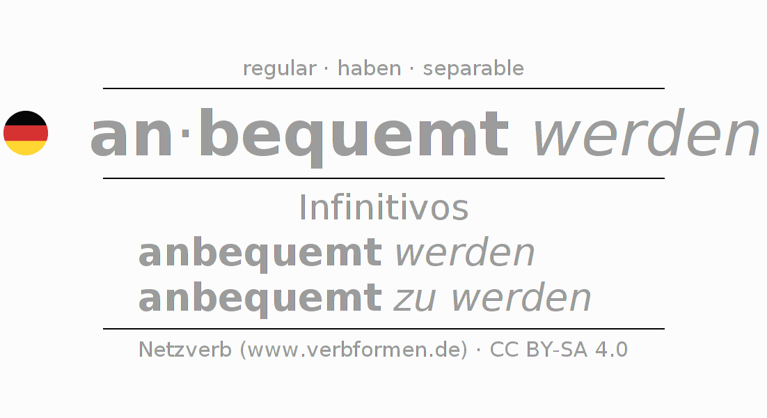 El verbo anbequemen, conjugado completamente en todas las personas y números gramaticales en Infinitivo Presente Pasado perfecto.