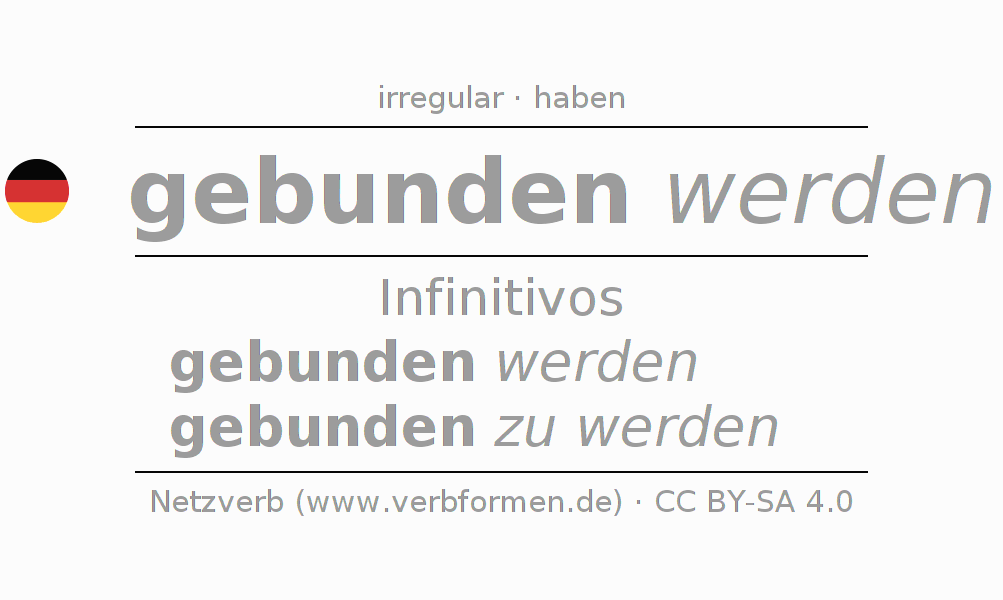 La conjugación de binden en Infinitivo Presente Pasado perfecto forma básica Pasivo procesivo es gebunden werden, gebunden zu werden.Para construir esta formas se requiere seguir algunas reglas gramaticales y también las especificaciones para la conjugación de verbos simples de binden en Infinitivo . Comentarios ☆