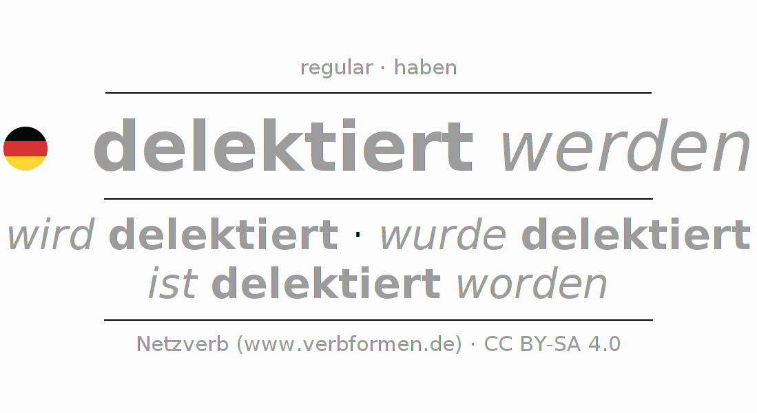 El verbo delektieren, conjugado completamente en todas las personas y números gramaticales en Infinitivo Presente Pasado perfecto.