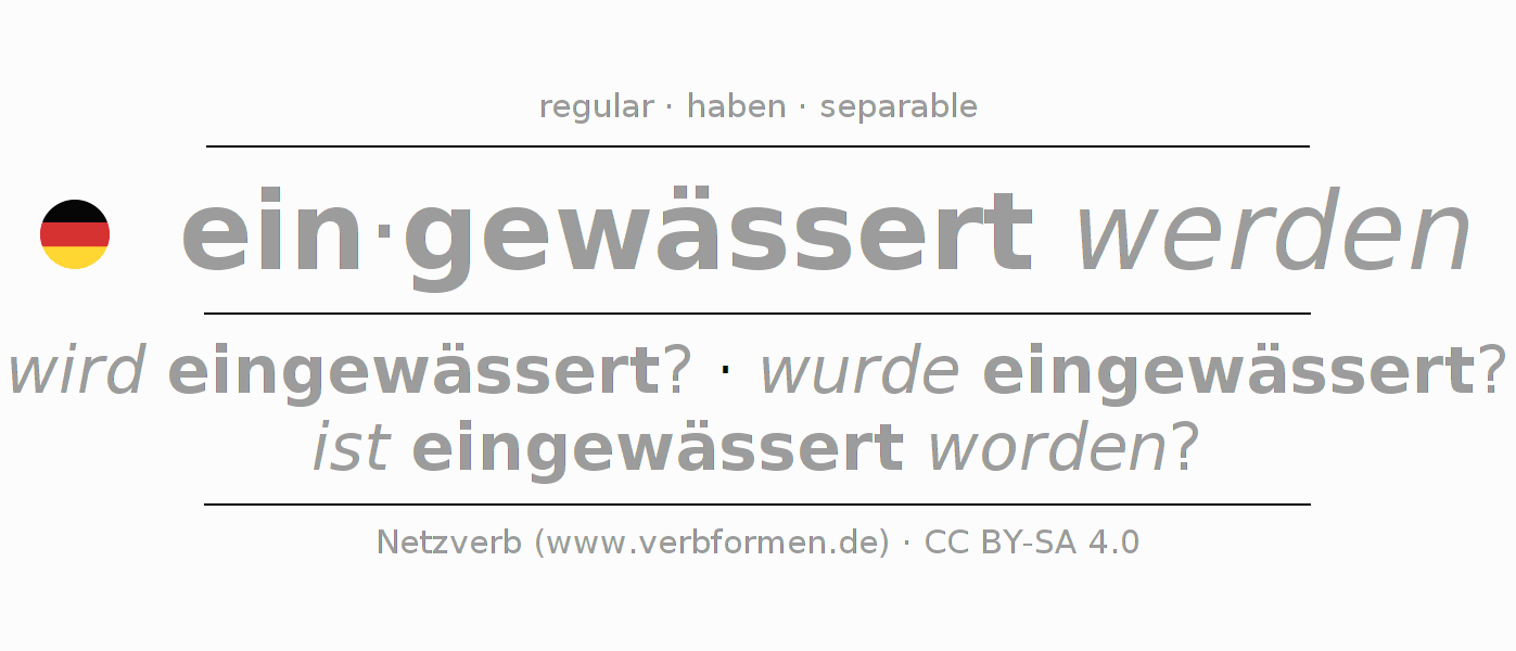 El verbo einwässern, conjugado completamente en todas las personas y números gramaticales en Infinitivo Presente Pasado perfecto.