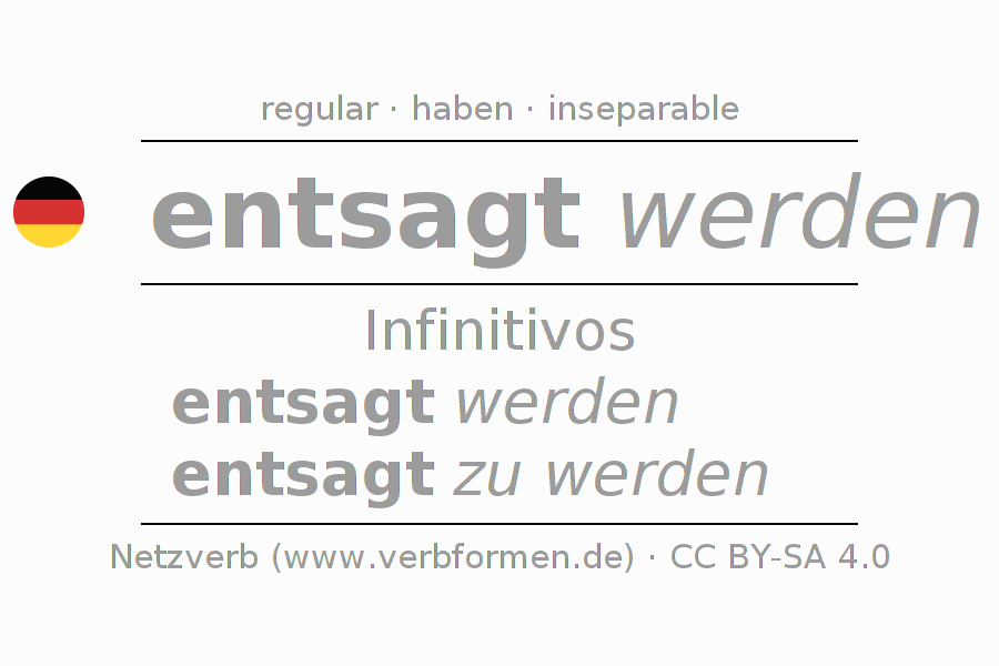 La conjugación de entsagen en Infinitivo Presente Pasado perfecto forma básica Pasivo procesivo es entsagt werden, entsagt zu werden.Para construir esta formas se requiere seguir algunas reglas gramaticales y también las especificaciones para la conjugación de verbos simples de entsagen en Infinitivo . Comentarios ☆