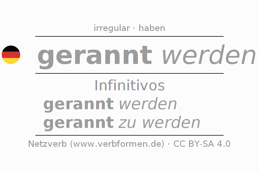 La conjugación de rennen en Infinitivo Presente Pasado perfecto forma básica Pasivo procesivo es gerannt werden, gerannt zu werden.Para construir esta formas se requiere seguir algunas reglas gramaticales y también las especificaciones para la conjugación de verbos simples de rennen en Infinitivo . Comentarios ☆