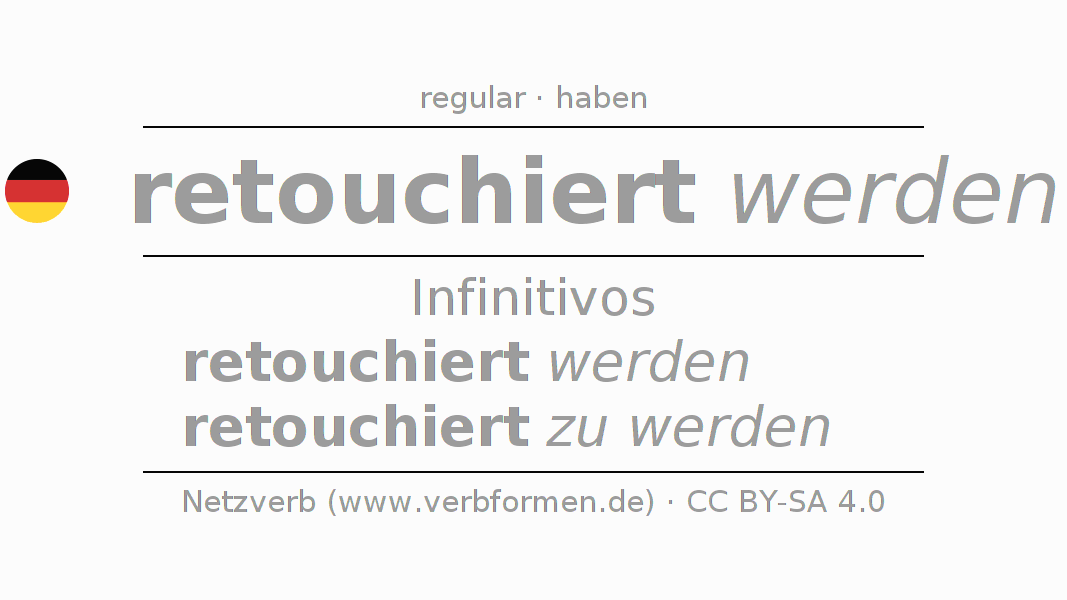 El verbo retouchieren, conjugado completamente en todas las personas y números gramaticales en Infinitivo Presente Pasado perfecto.