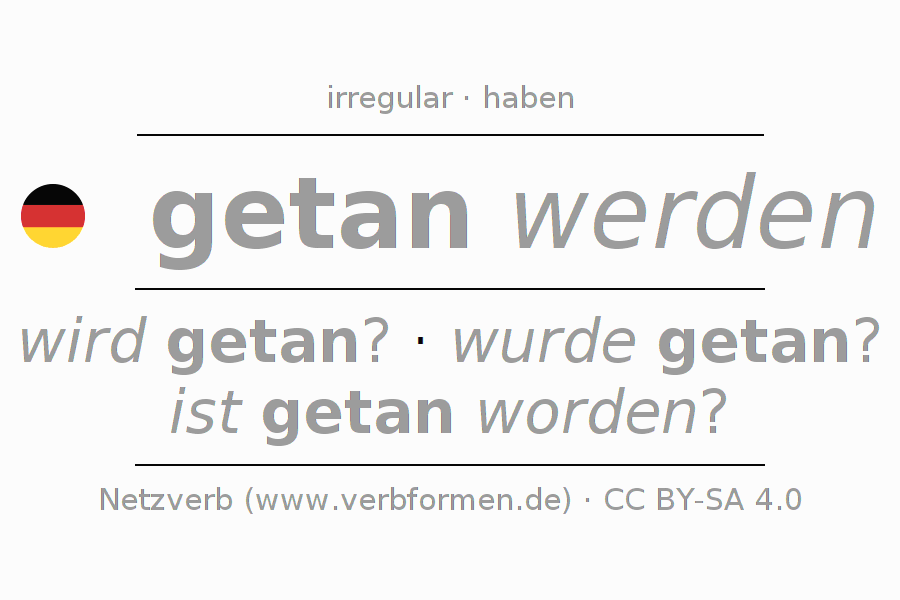 La conjugación de tun en Infinitivo Presente Pasado perfecto forma básica Pasivo procesivo es getan werden, getan zu werden.Para construir esta formas se requiere seguir algunas reglas gramaticales y también las especificaciones para la conjugación de verbos simples de tun en Infinitivo . Comentarios ☆