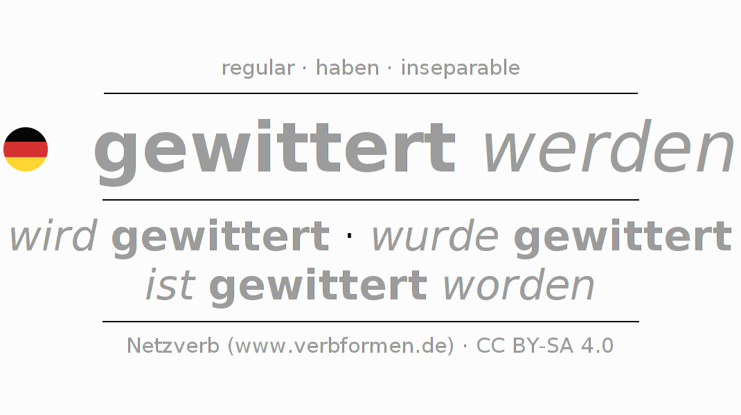 El verbo gewittern, conjugado completamente en todas las personas y números gramaticales en Infinitivo Presente Pasado perfecto.