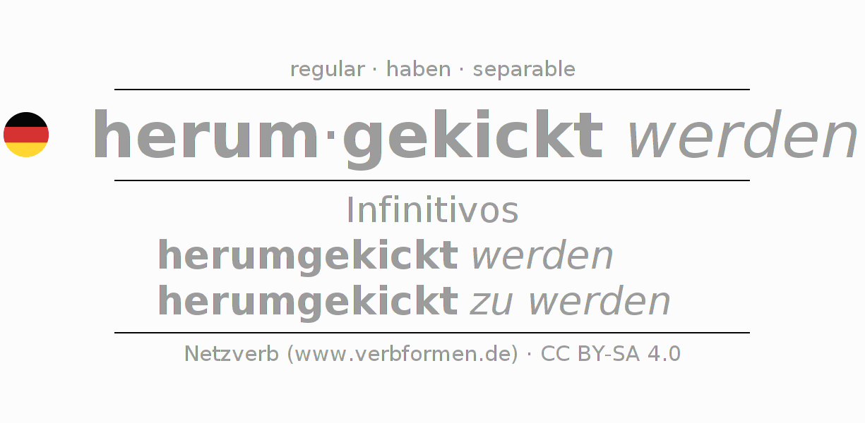 El verbo herumkicken, conjugado completamente en todas las personas y números gramaticales en Infinitivo Presente Pasado perfecto.