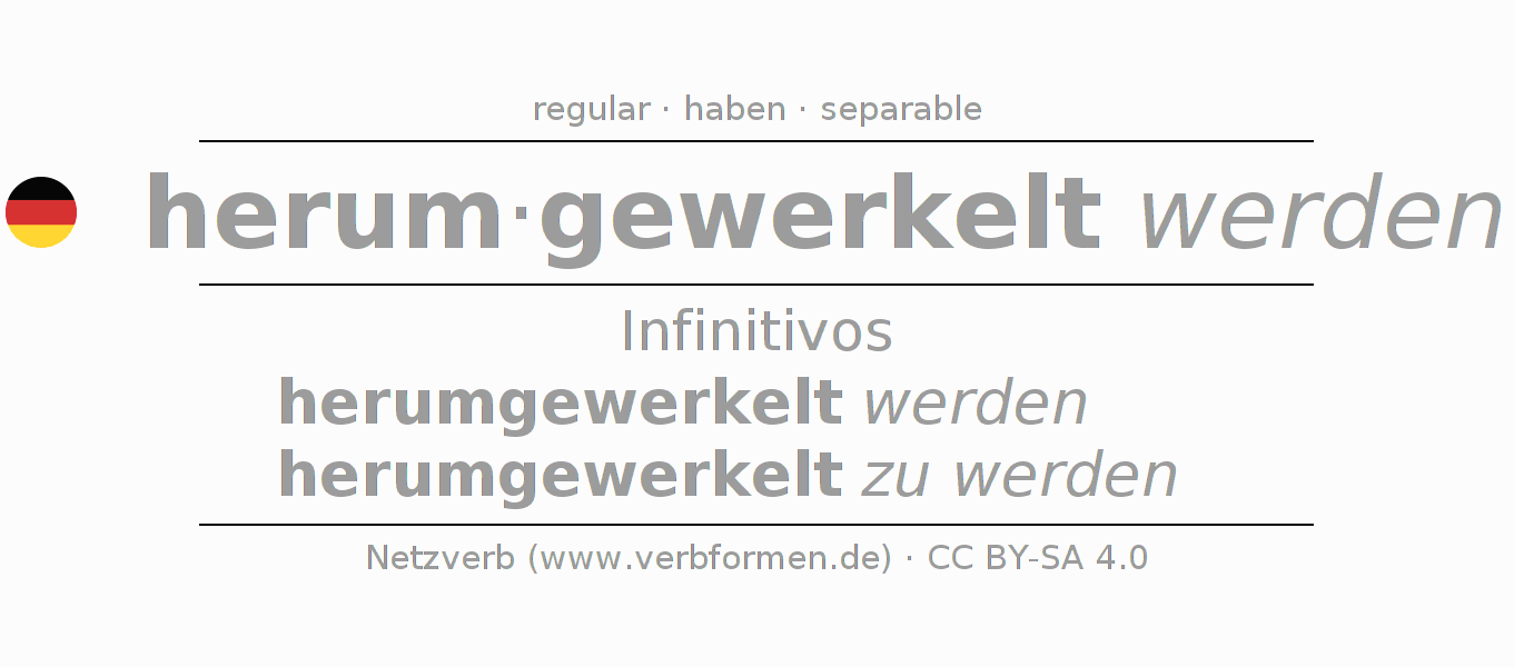 El verbo herumwerkeln, conjugado completamente en todas las personas y números gramaticales en Infinitivo Presente Pasado perfecto.