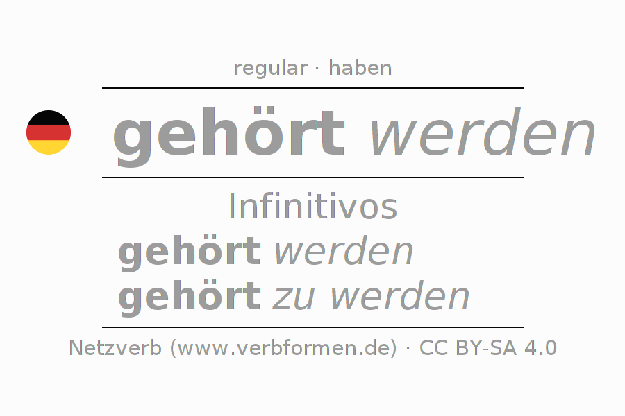 La conjugación de hören en Infinitivo Presente Pasado perfecto forma básica Pasivo procesivo es gehört werden, gehört zu werden.Para construir esta formas se requiere seguir algunas reglas gramaticales y también las especificaciones para la conjugación de verbos simples de hören en Infinitivo . Comentarios ☆