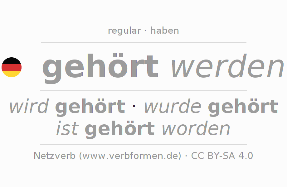 El verbo hören, conjugado completamente en todas las personas y números gramaticales en Infinitivo Presente Pasado perfecto.
