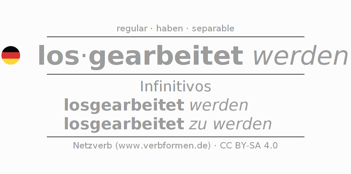 El verbo losarbeiten, conjugado completamente en todas las personas y números gramaticales en Infinitivo Presente Pasado perfecto.