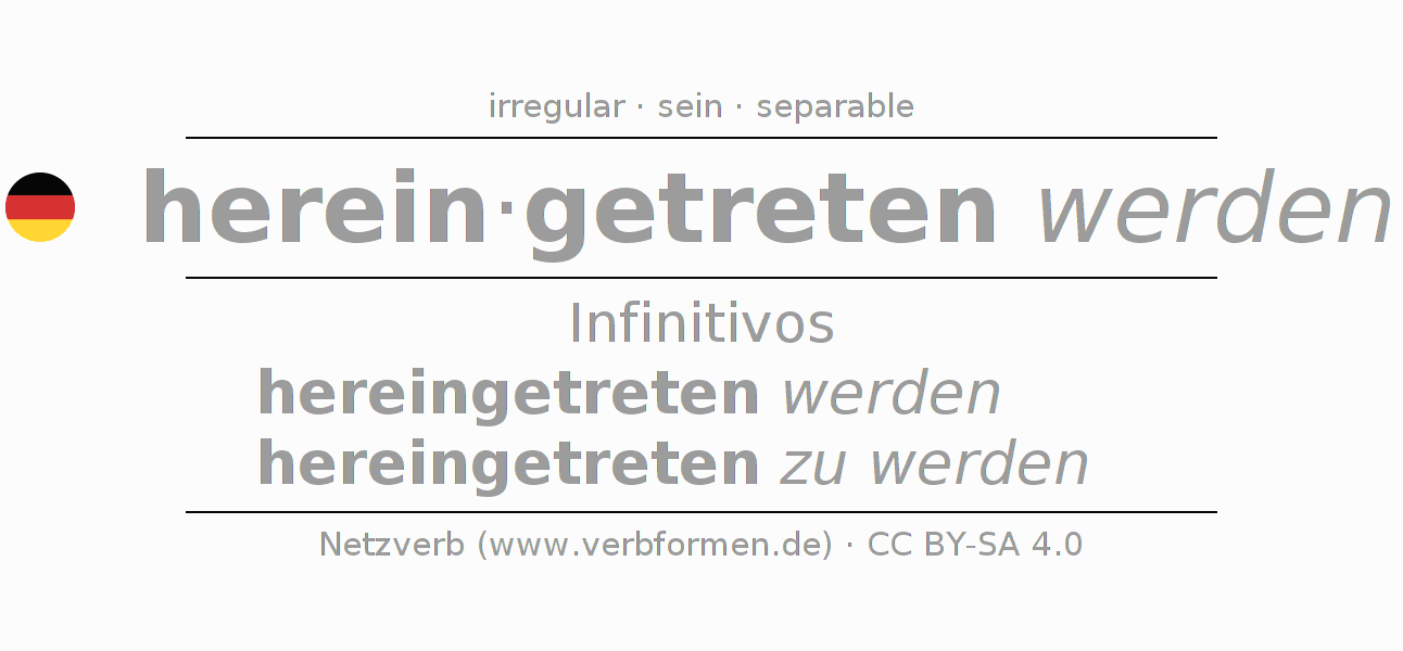 El verbo hereintreten, conjugado completamente en todas las personas y números gramaticales en Infinitivo Presente Pasado perfecto.
